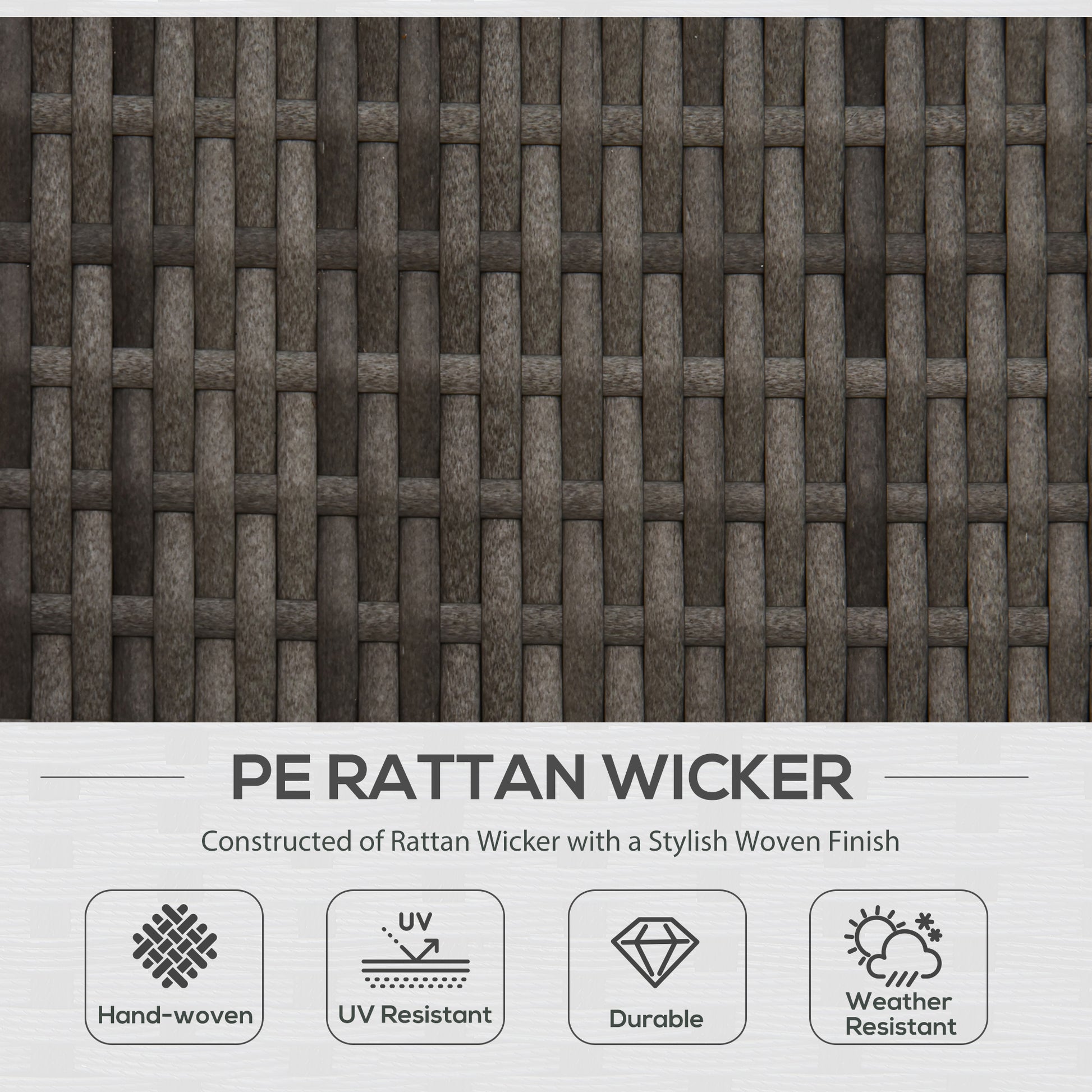 Our five-piece rattan patio sectional set brings the comforts of the living room to the backyard. Everything is there: a couch composed of two corners and a center section, an ottoman footrest, and a tempered glass table. Enjoy an outdoor couch with perks like throw pillows, thickly padded cushions, and a place to put your feet up. Offering a home base for outdoor activities, it easily becomes the icing on top of pool parties, picnics, and backyard barbeques. Get out, get comfy, get Outsunny. Features: - Five-piece outdoor sectional furniture set with a sofa to seat three adults - PE rattan offers the same handwoven style as classic wicker with better outdoor endurance - Heavy-duty galvanized steel frame - Throw pillows and 4" thick seat and backrest cushions - You can remove the zippered cushion/pillow covers to spot-clean them when they become dirty - A dining space that wipes clean, so you don't have to worry about spills Specification: - Rattan Color: Mixed Gray - Cushion Color: Charcoal Gray - Throw Pillow Color: Charcoal Gray - Materials: PE Rattan, Galvanized Steel - Corner Section Size: 29.5" W x 29.5" D x 25.25" H - Stand Alone Size: 26.5" W x 29.5" D x 25.25" H - Ottoman Size: 29.5" W x 29.5" D x 13" H - Coffee Table Size: 35.5" W x 19.75" D x 13" H - Seat Size: 24.75" W x 24.75" W - Seat to Floor Size: 13" H - Weight Capacity: 395 lbs. / per seat, 110 lbs. (Table) - Item Label: 860-097CG Package Includes: - 2 x Corner Segment - 1 x Stand Alone Segment - 1 x Footrest - 1 x Table - 2 x Throw Pillow - 4 x Seat Cushion - 3 x Back Cushion Our five-piece rattan patio sectional set brings the comforts of the living room to the backyard. Features: - Five-piece outdoor sectional furniture set with a sofa to seat three adults - PE rattan offers the same handwoven style as classic wicker with better outdoor endurance - Heavy-duty galvanized steel frame - Throw pillows and 4" thick seat and backrest cushions - You can remove the zippered cushion/pillow covers to spot-clean them when they become dirty - A dining space that wipes clean, so you don't have to worry about spills Specification: - Rattan Color: Mixed Gray - Cushion Color: Light Gray - Throw Pillow Color: Light Gray - Materials: PE Rattan, Galvanized Steel - Corner Section Size: 29.5" W x 29.5" D x 25.25" H - Stand Alone Size: 26.5" W x 29.5" D x 25.25" H - Ottoman Size: 29.5" W x 29.5" D x 13" H - Coffee Table Size: 35.5" W x 19.75" D x 13" H - Seat Size: 24.75" W x 24.75" W - Seat to Floor Size: 13" H - Weight Capacity: 395 lbs. (Table) - Item Label: 860-097GY Package Includes: - 2 x Corner Segment - 1 x Stand Alone Segment - 1 x Footrest - 1 x Table - 2 x Throw Pillow - 4 x Seat Cushion - 3 x Back Cushion.