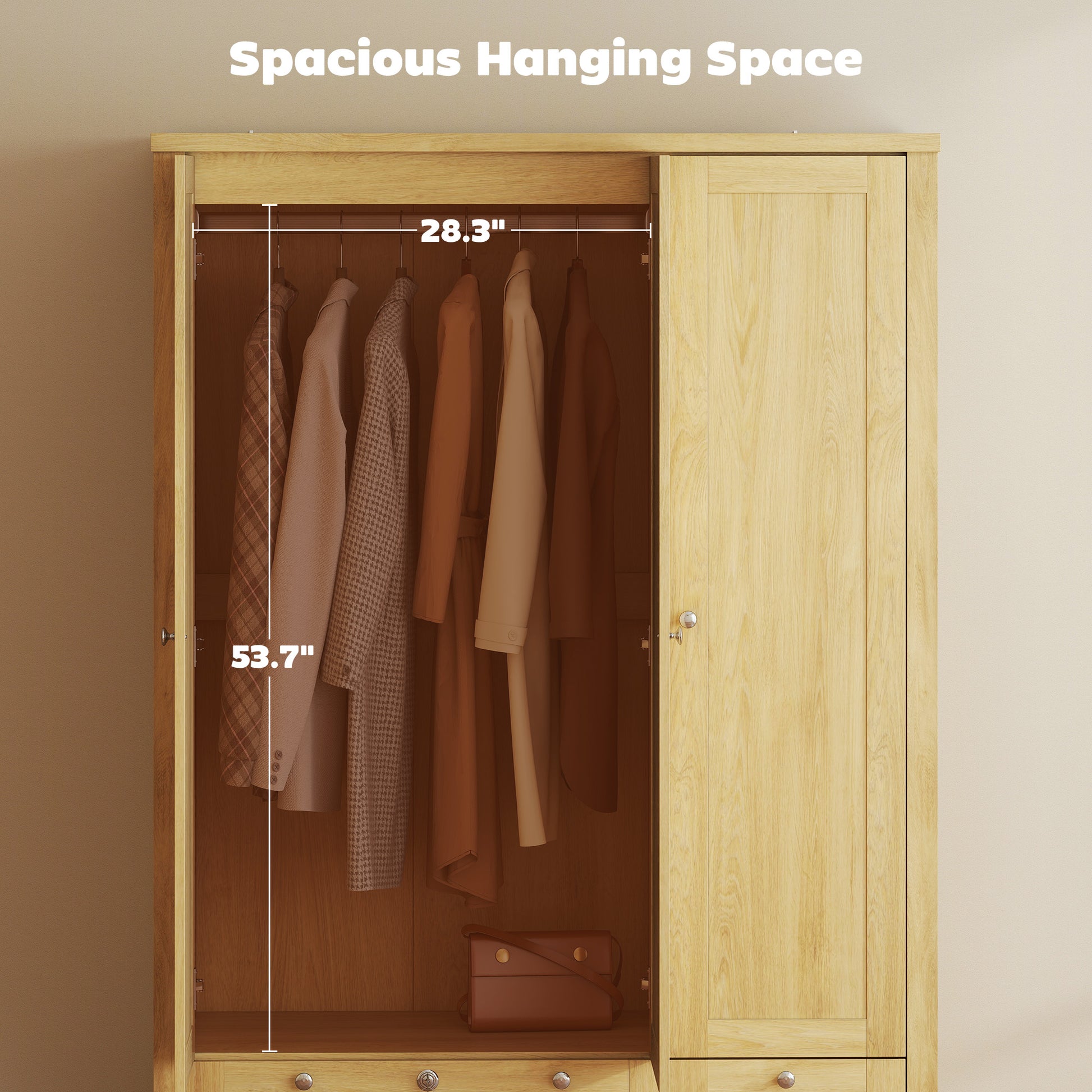 Inside, you’ll find generous hanging space for shirts, jackets, and dresses, plus dual lower drawers for folded essentials. The three-door layout makes everything easy to access, while the sturdy frame and metal hinges ensure long-term durability.